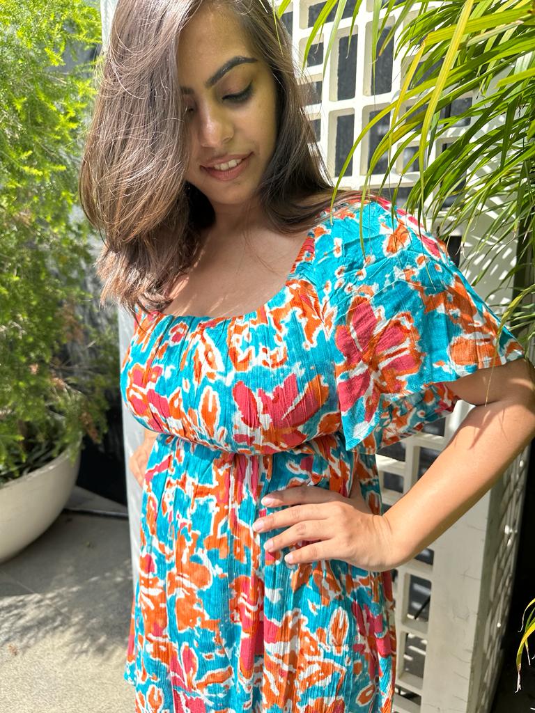 The dress has elastic on the waist, back and shoulders, free-flowing sleeves and a cute back tie detail which rests over the bra band seamlessly.