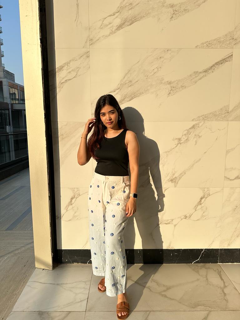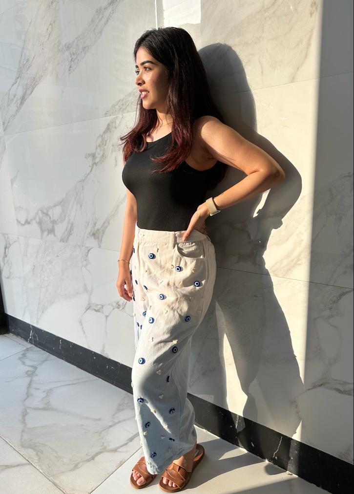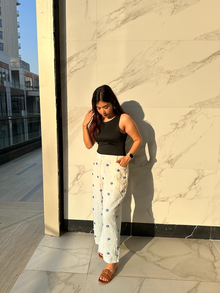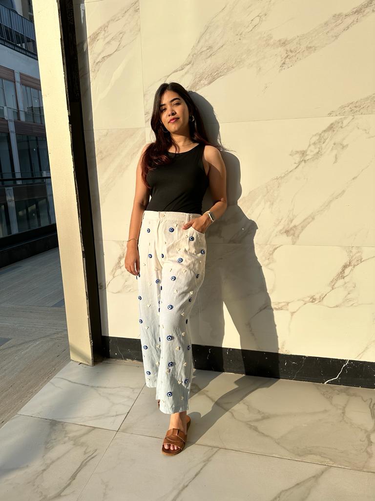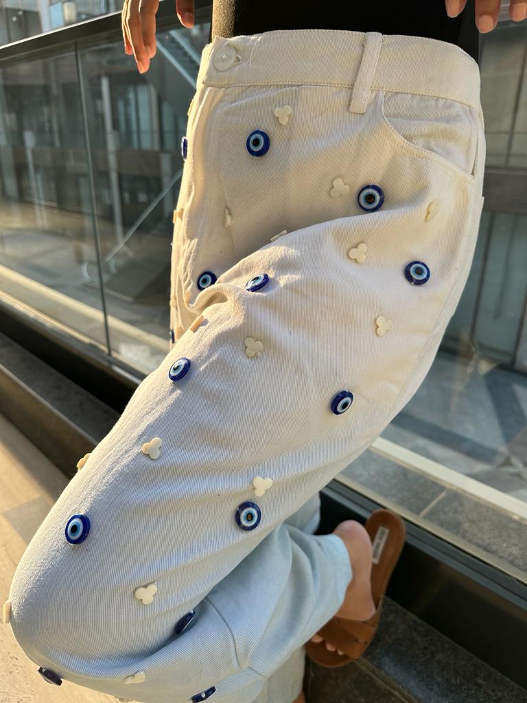 The two-tone Charm jeans are crafted in denim twill, hand-dyed to the stunning blue and white ombre tones and hand-embellished with evil-eye and mother-of-pearl cloud motifs.
