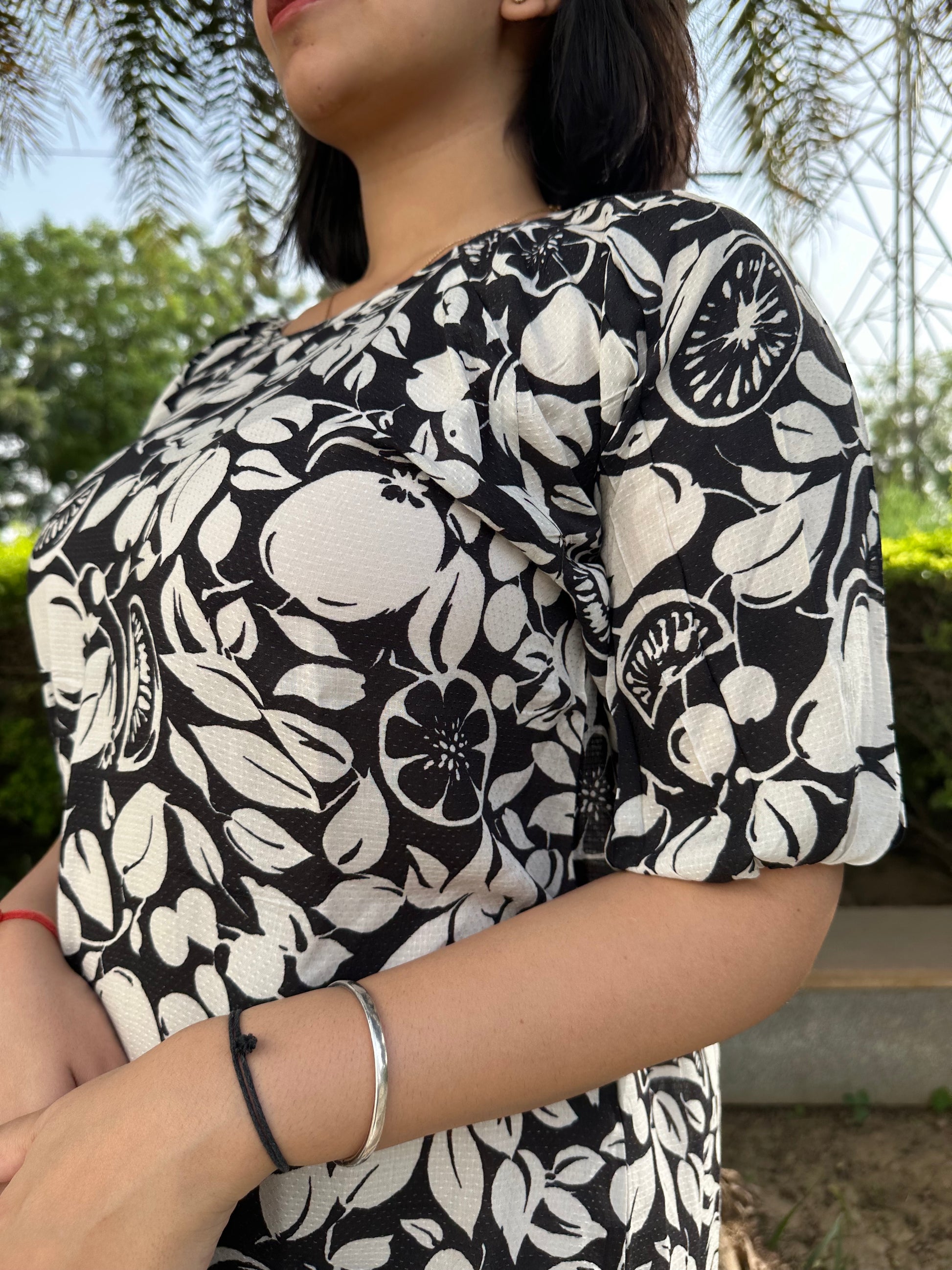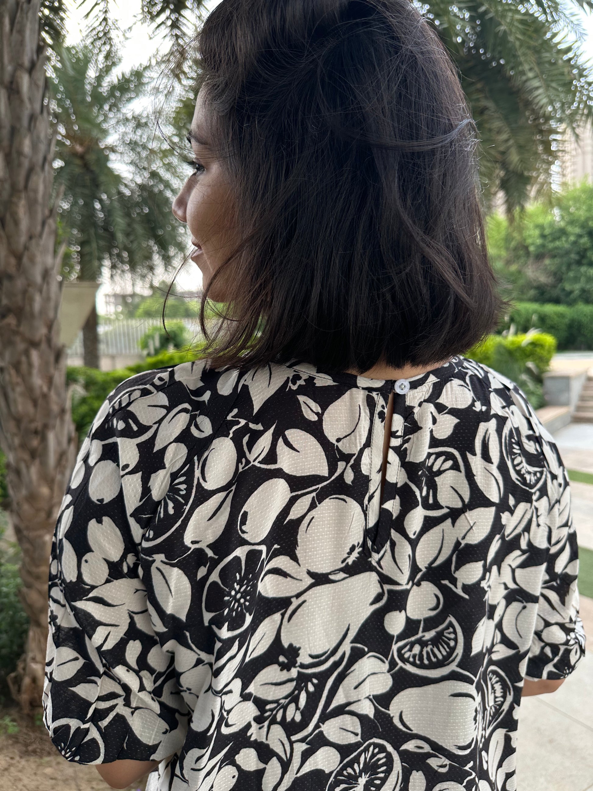 The flowy, half-sleeve dress has a keyhole detail at the back for ease of wearing.