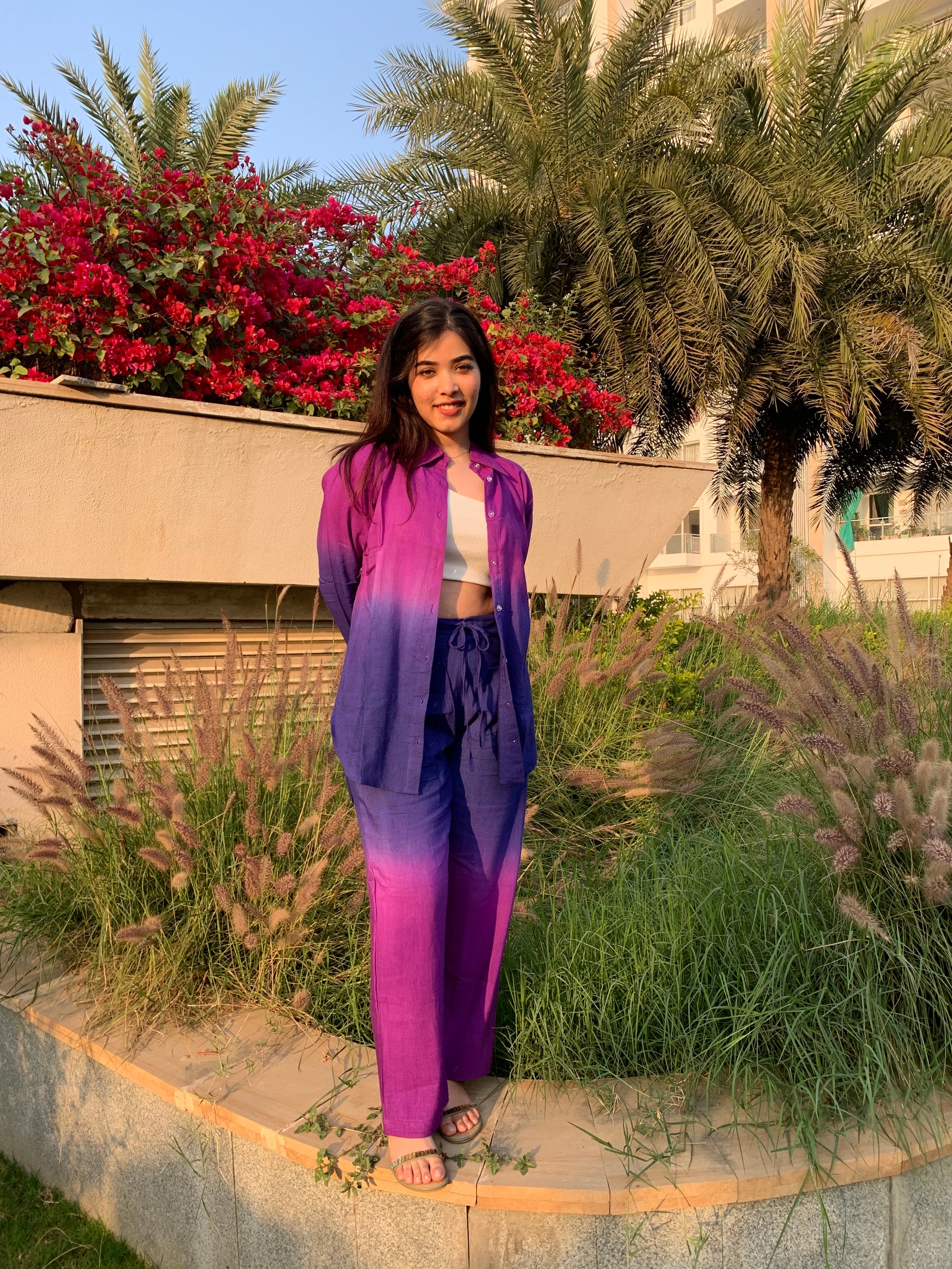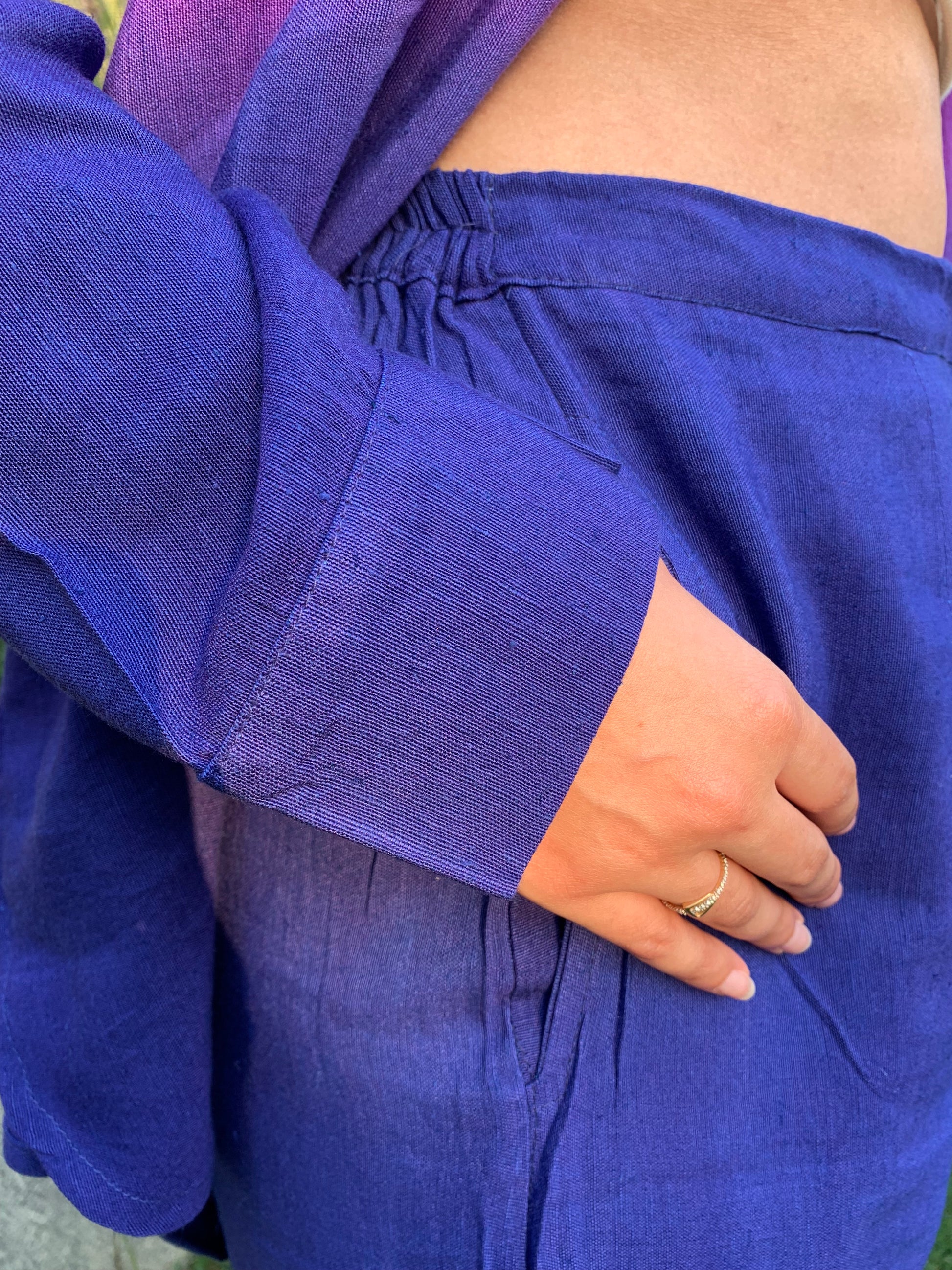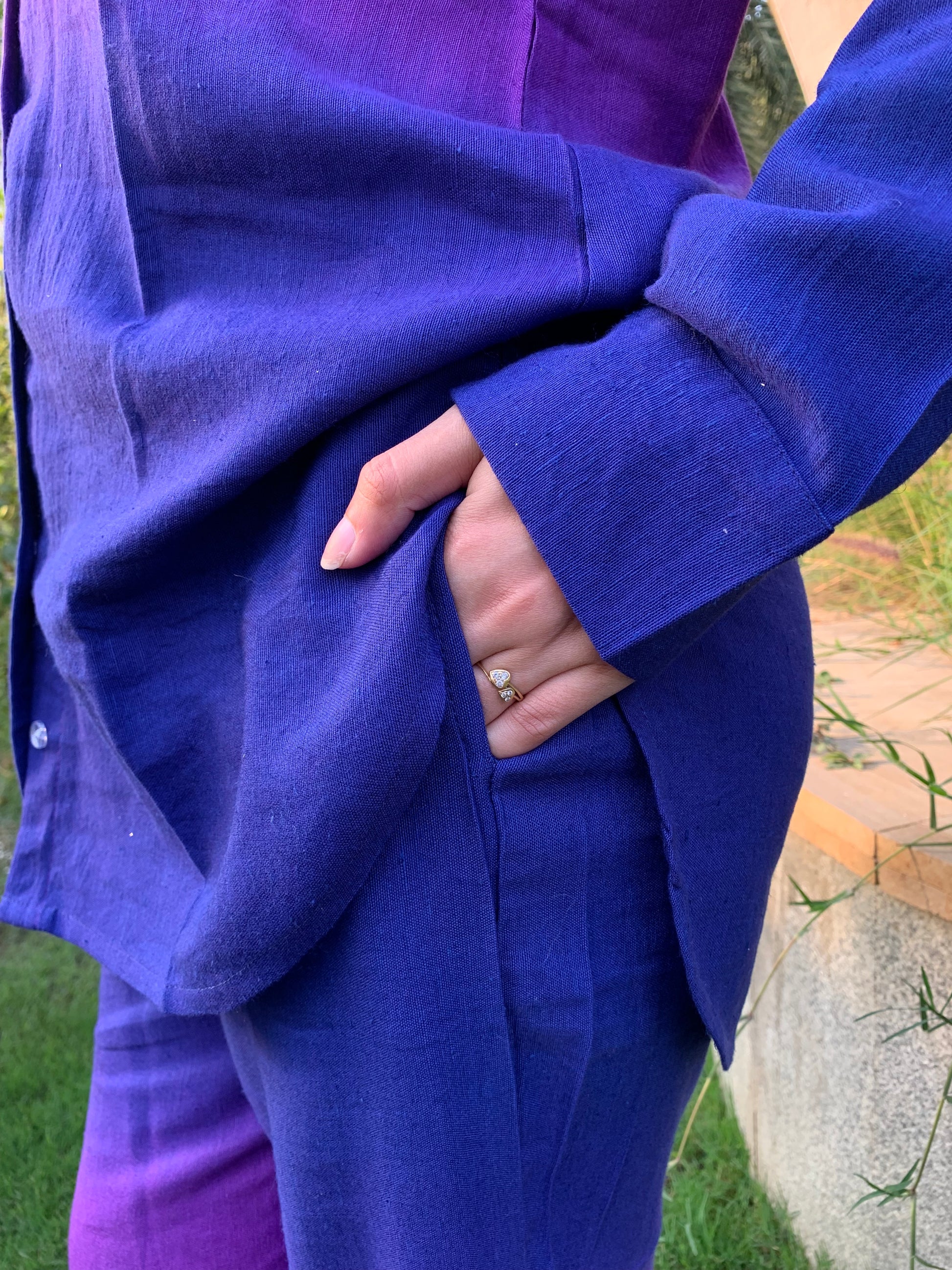 The Plum Set, features a relaxed-fit shirt and trousers, both in cotton flax fabric.