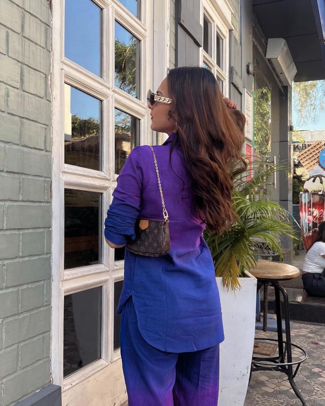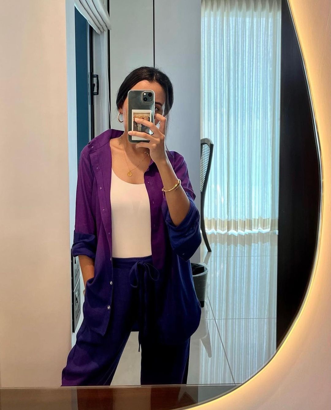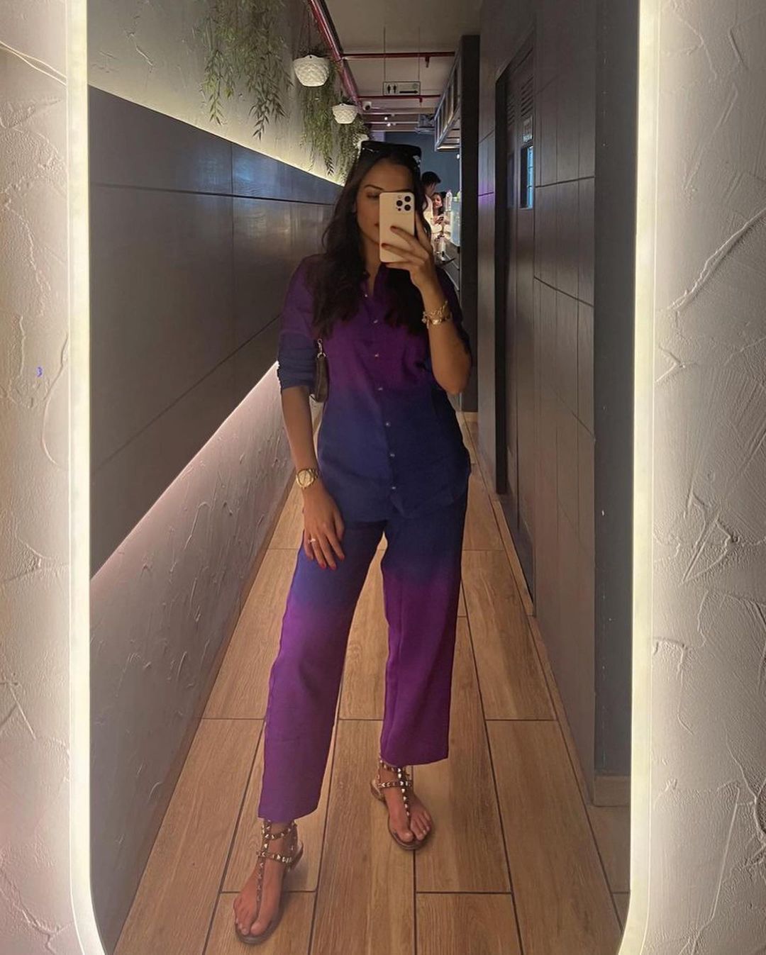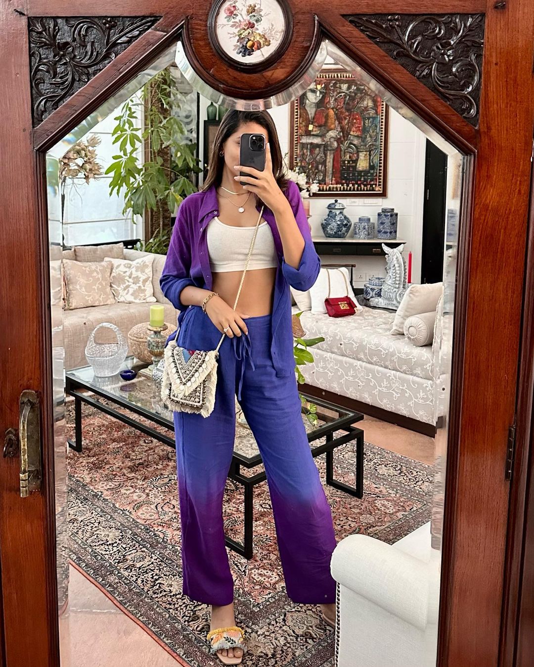 The Plum Set, features a relaxed-fit shirt and trousers, both in cotton flax fabric.