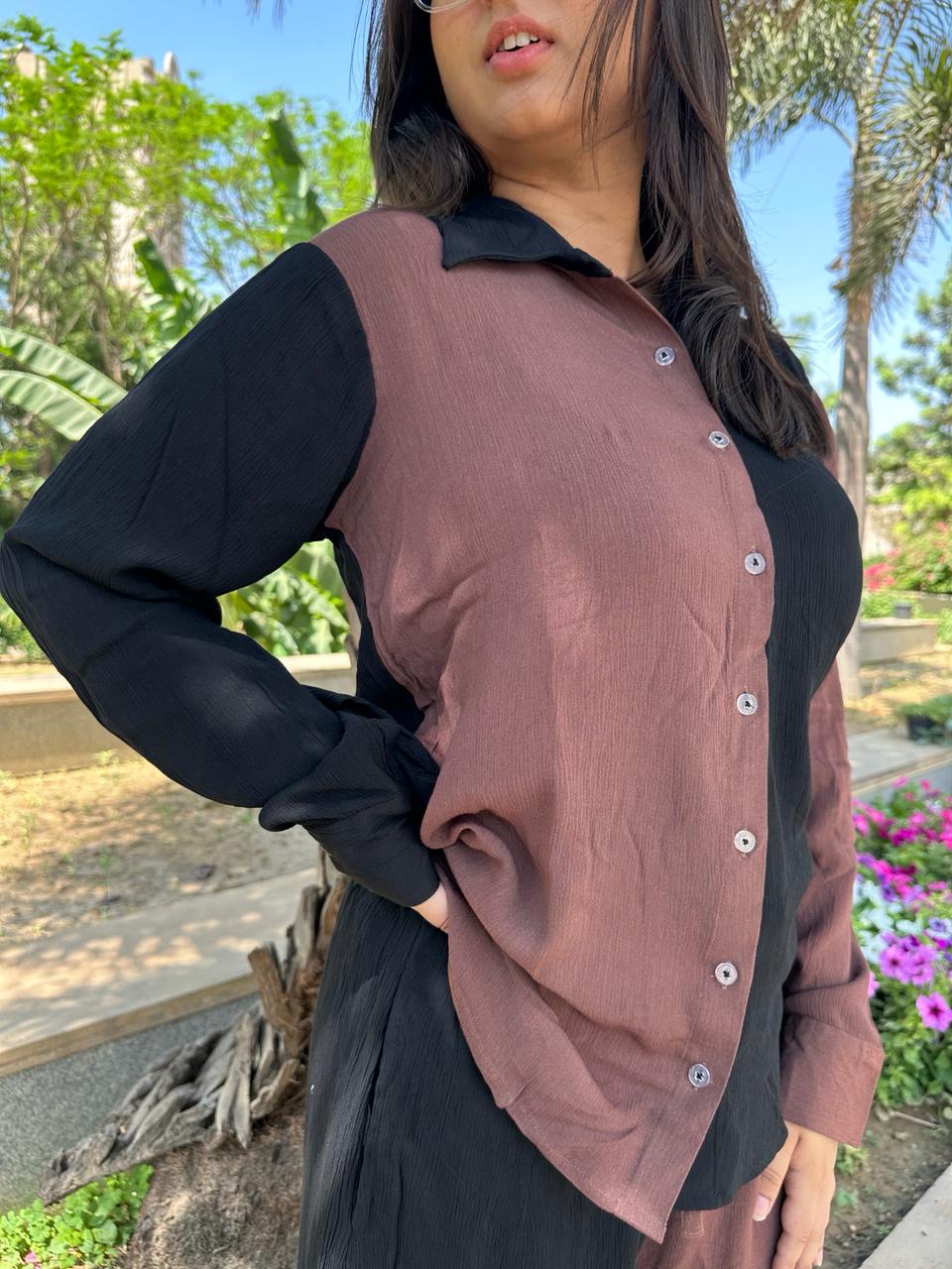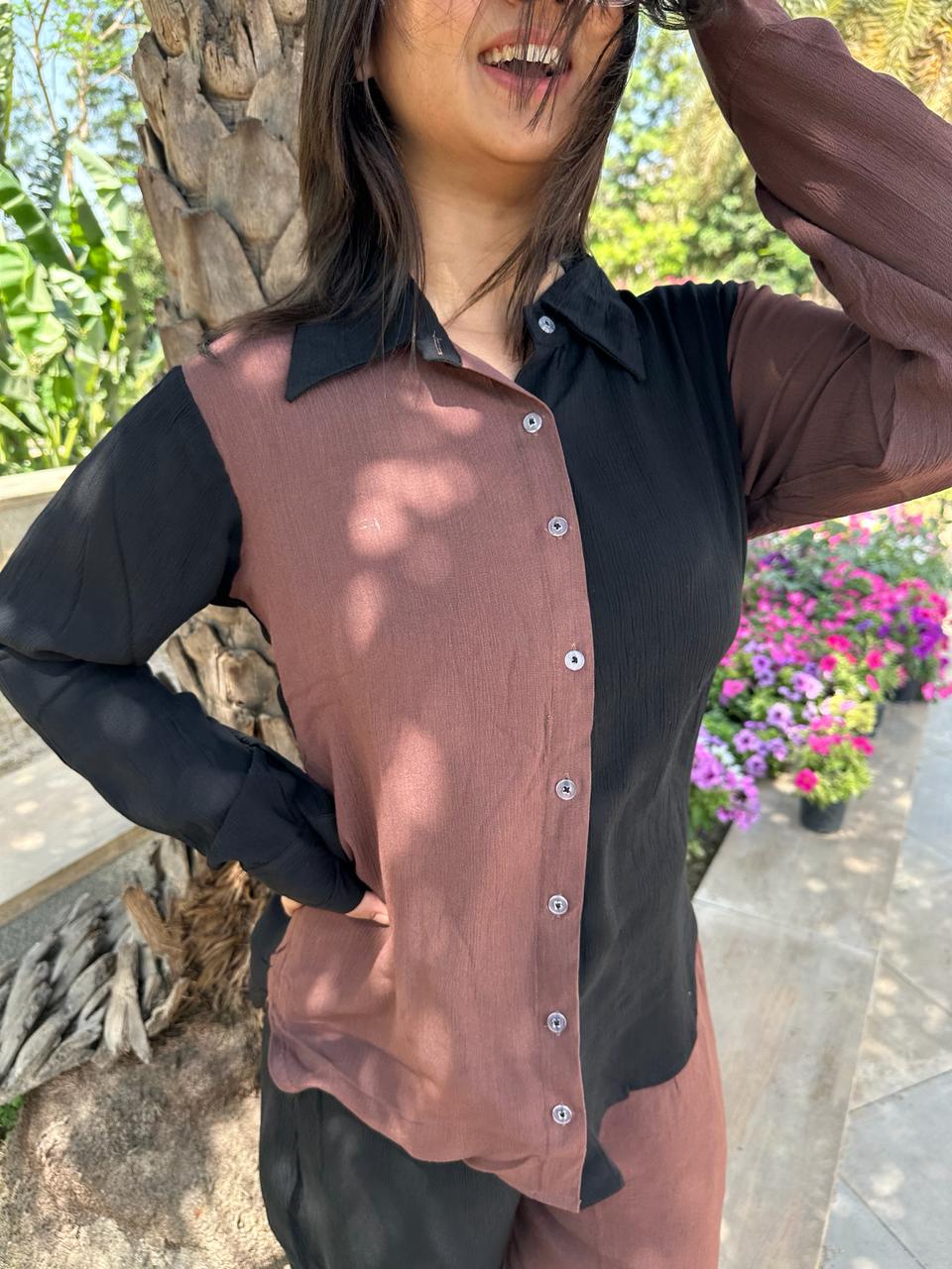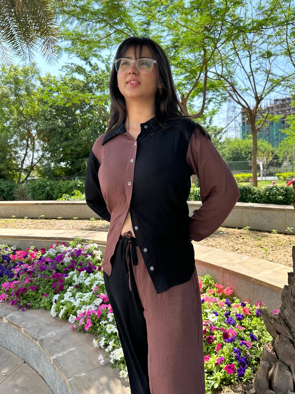 The shirt is a classic button-down with high slits, and the mid-waist pants feature pockets, an elasticated back and drawstrings in the front.