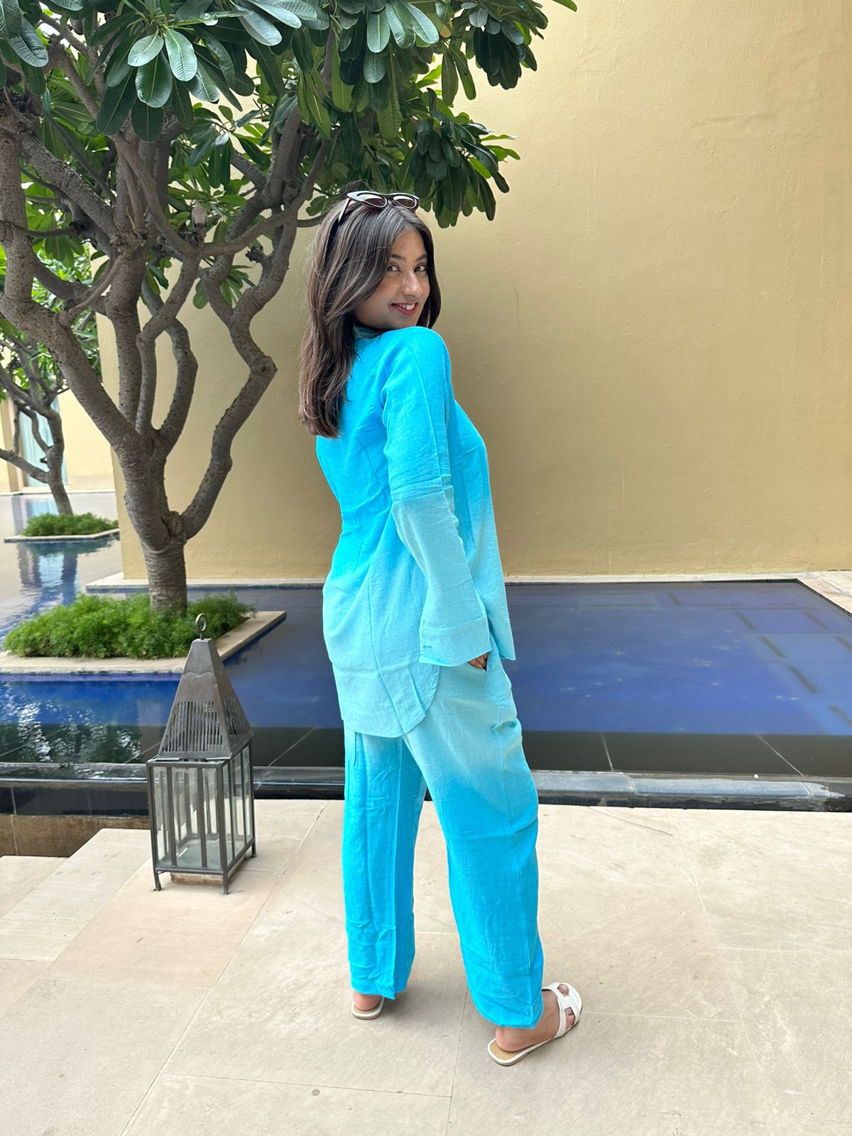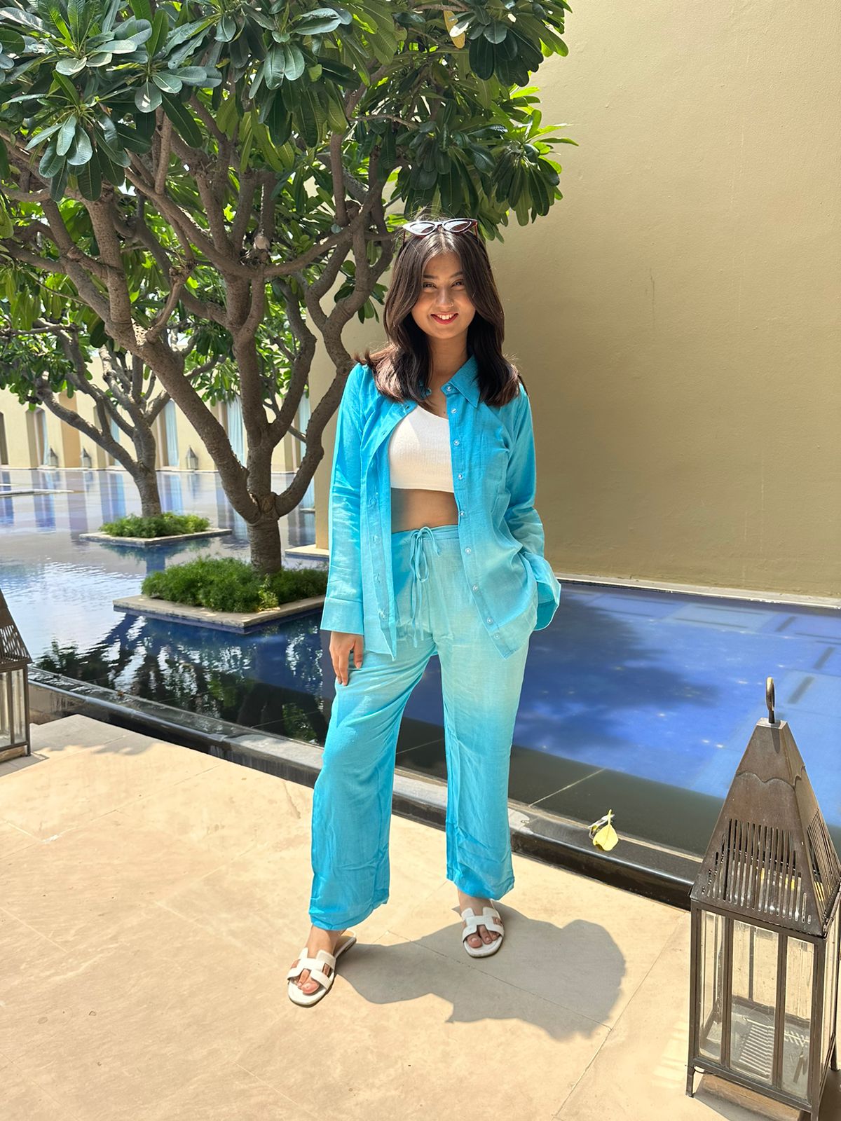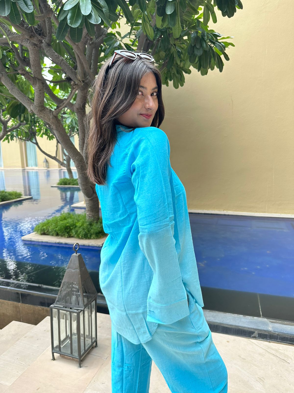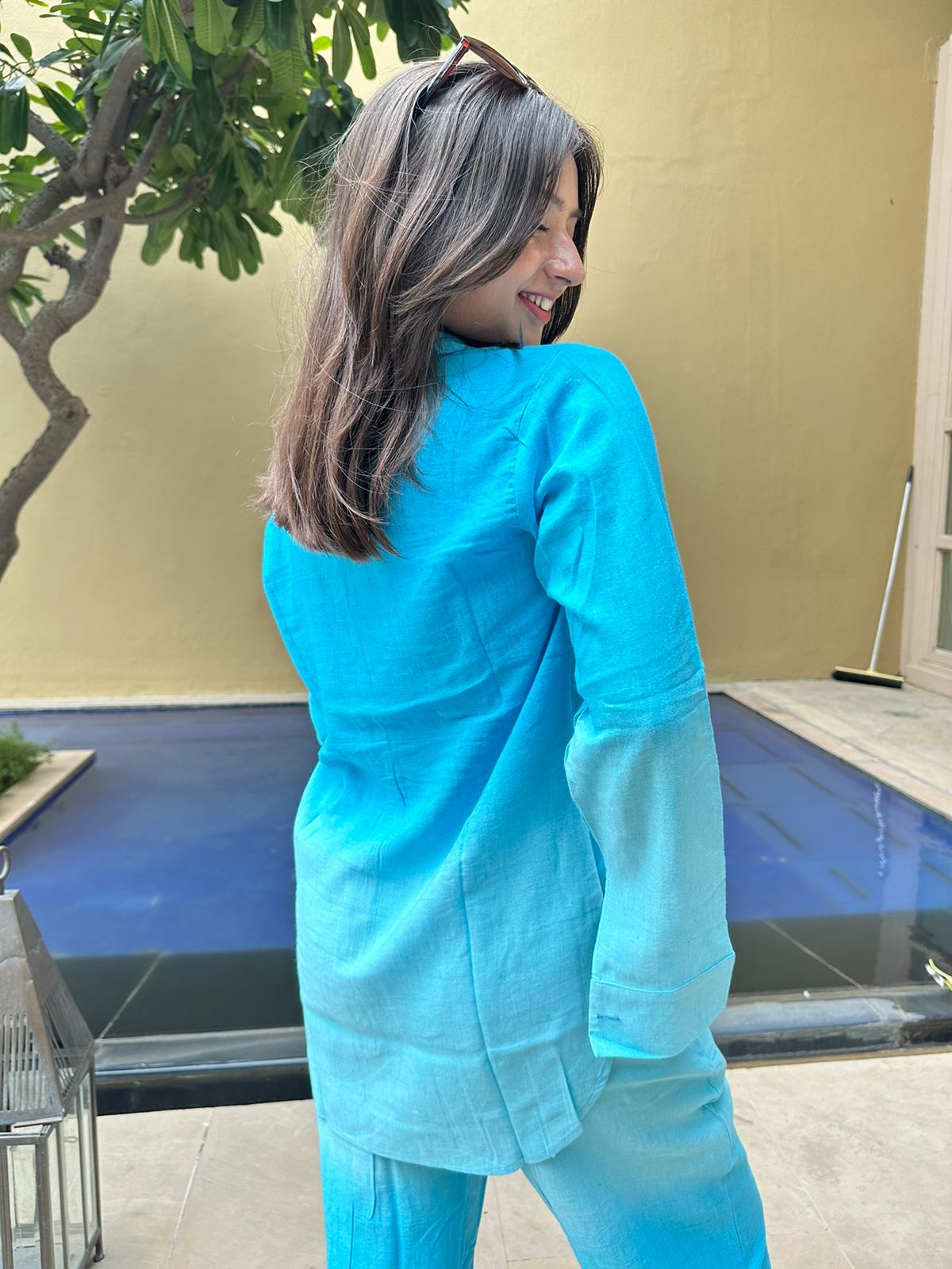 The Water set, features a relaxed-fit shirt and trousers, both in cotton flax fabric.